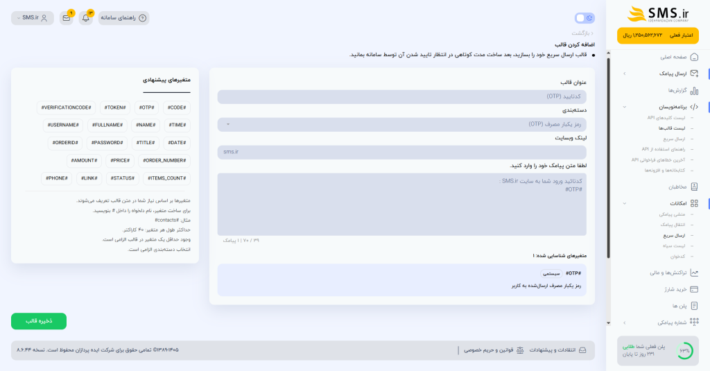 - متن پیامک: این بخش، هدف نهایی یعنی همان متنی که برای مخاطب ارسال میشود است. هر متنی که وارد میکنید، در بخشی که قصد دارید کدتائید جایگزین و ارسال شود، عبارت #CODE# یا #OTP# را از باکس سمت چپ انتخاب و وارد کنید. مثال: کدتائید شما جهت ورود به سایت شکرینو (نام سایت خودتان)، #code# میباشد.