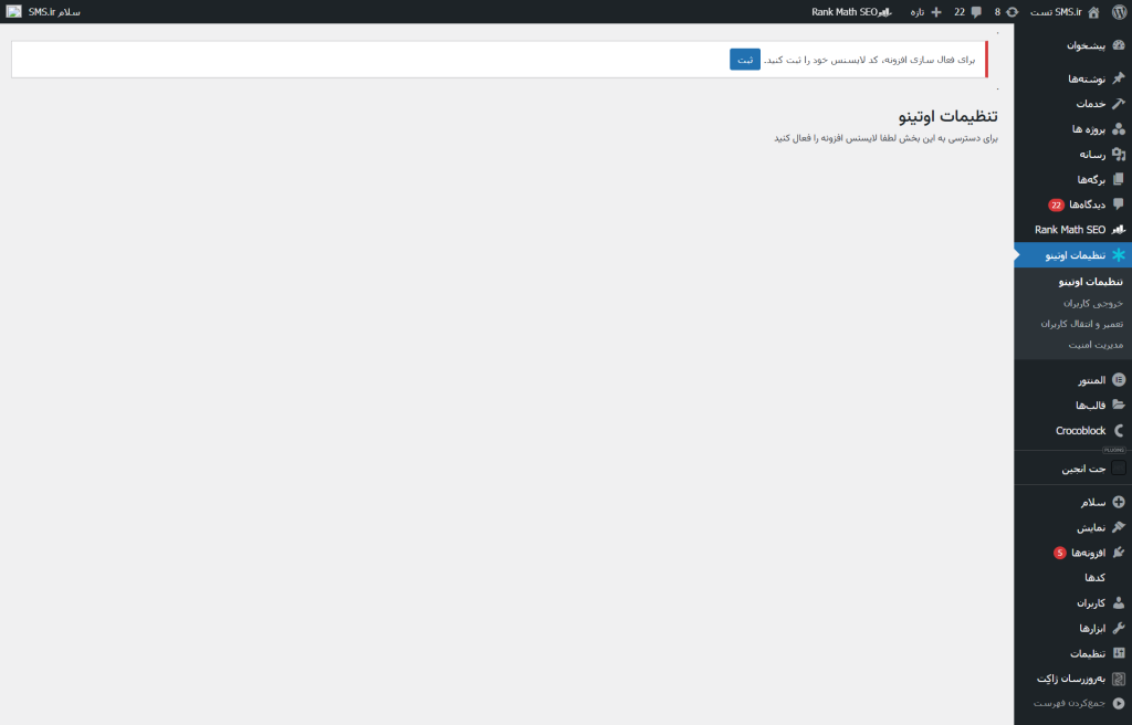 بعد از فعالسازی، بخش “تنظیمات اوتینو” به منوهای کناری پیشخوان وردپرس شما اضافه خواهد شد. در این مرحله با پیغام “برای فعال سازی افزونه، کد لایسنس خود را ثبت کنید.” مواجه خواهید شد و نیاز است با کلیک بر روی گزینه “ثبت” لایسنس دریافتی از سایت شکرینو را وارد و ثبت کنید.