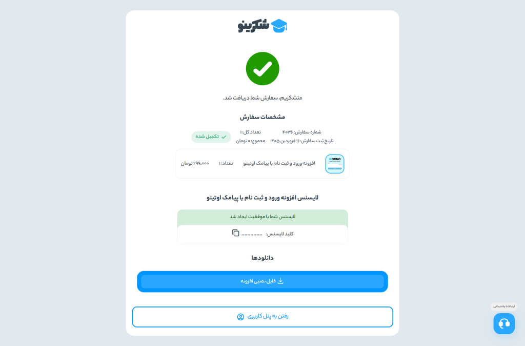 وارد سایت شکرینو شوید و افزونه اوتینو را از توسعهدهنده آن خریداری کنید. بعد از خرید یک فایل zip که حاوی افزونه و یک لایسنس اختصاصی (بعد از وارد کردن آدرس سایتتان) برای شما ایجاد خواهد شد.