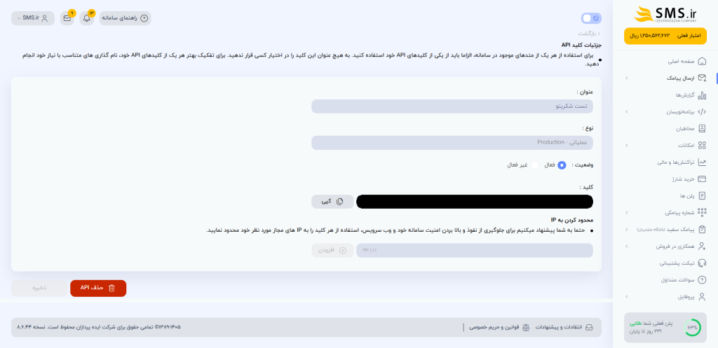 - نوع کلید: در SMS.ir دو نوع کلید (عملیاتی / Production) برای زمانی که قصد استفاده کامل و واقعی از API را دارید و (تست / Sandbox) برای زمانی که قصد استفاده واقعی و ارسال پیامک را ندارید و صرفا میخواهید پیادهسازی API و عملکرد آن را بررسی کنید وجود دارد. چنانچه هدف شما پیادهسازی و ارسال پیامک است، کلید عملیاتی را انتخاب کنید.